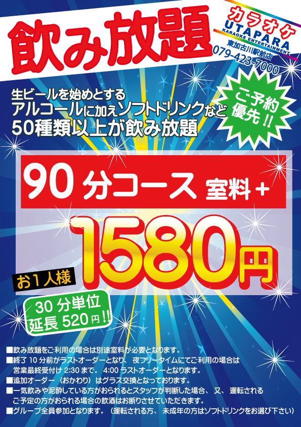 ■うたぱら 東加古川駅前店アルコール飲み放題プラン※上記飲み放題料金は別途室料が発生致します。
